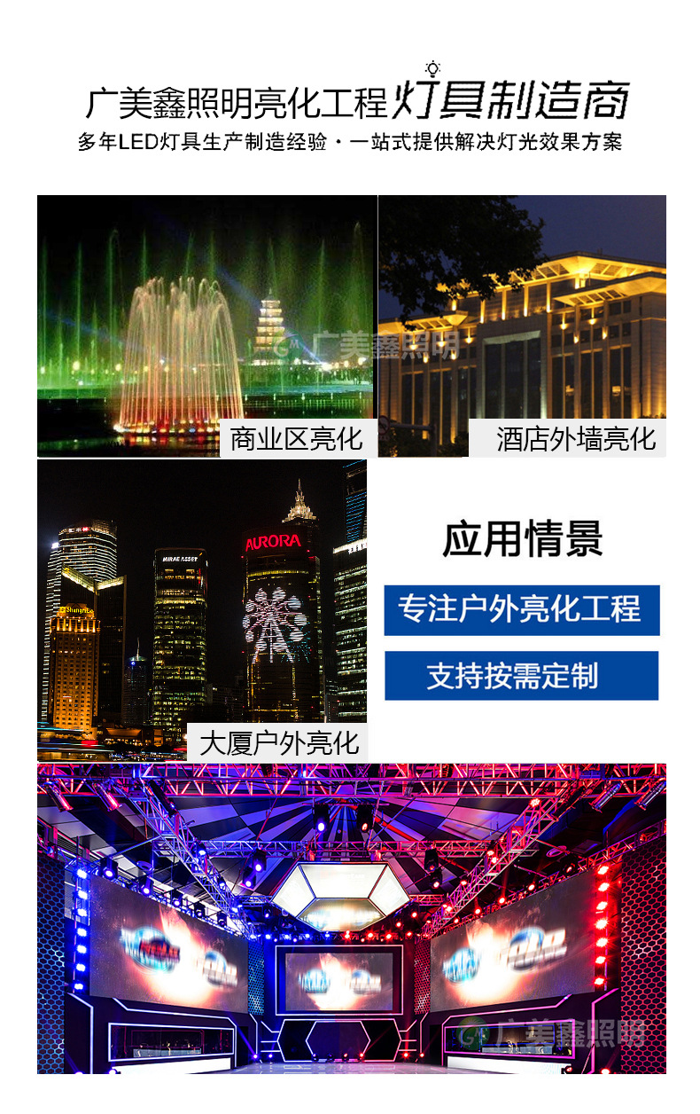 | 用途范圍 | 戶外、廣場、公園、建筑、景觀 | 特色服務 | 破損補寄 | 燈光顏色 | 暖白,正白,冷白,黃色,紅色,藍色,綠色,RGB |